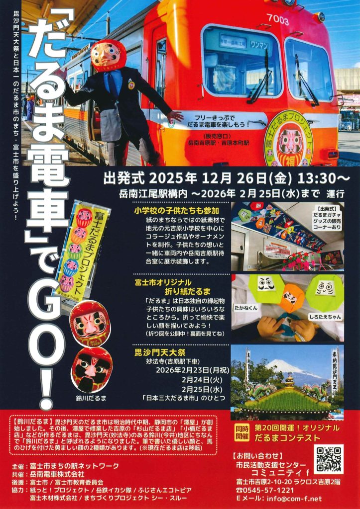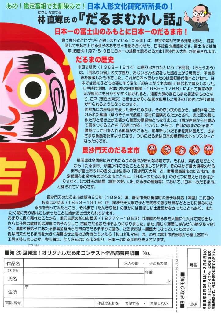 富士市まちの駅中部エリアの各駅で600円で販売している、地元の「鈴川だるま」の白だるまを購入し、自由に色彩や加工をして、応募用紙とともにコミュニティf(富士市吉原2-10-20)へ提出してください。
