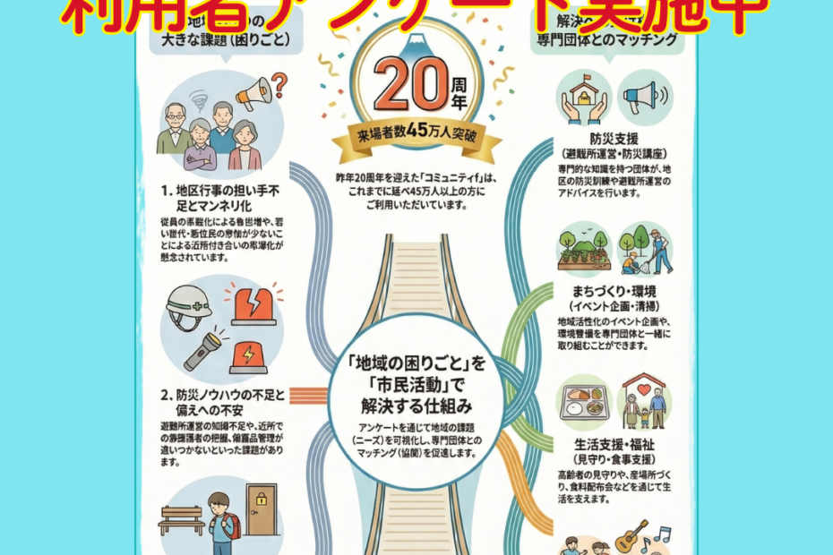 いつもご利用ありがとうございます。当センターはお陰様で昨年20周年を迎えました。今年は、皆様の地域が抱える「困りごと」を可視化し、市民活動との「協働(マッチング)」につなげるための調査を行います。 3分程度で完了しますの… 続きを読む »R8年 利用者アンケートご協力をお願いします!!