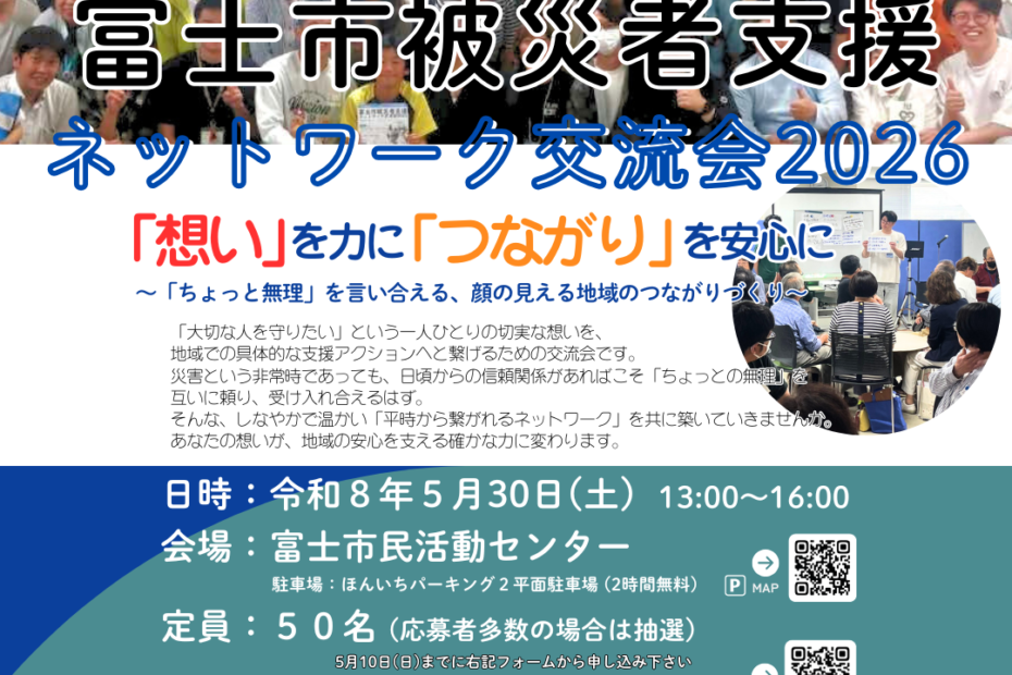 「想い」を力に 「つながり」を安心に「大切な人を守りたい」という一人ひとりの切実な想いを、地域の安心を支える具体的なアクションへと繋げるための交流会を開催いたします。 3年目を迎える本交流会ですが、今年度からは新たに「富… 続きを読む »被災者支援ネットワーク交流2026 開催
